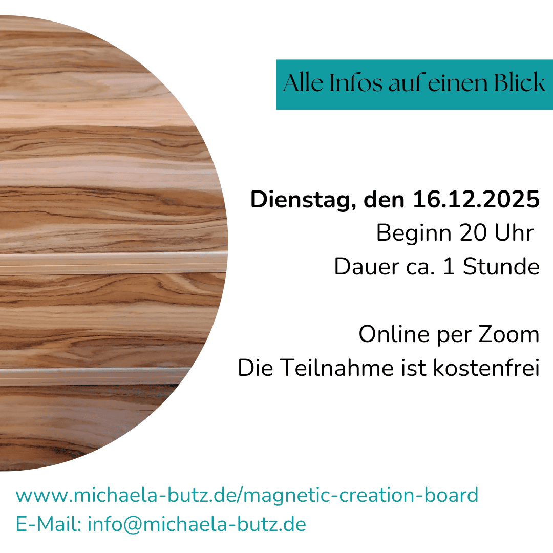 Du kannst das Magnetic Creation Board© jederzeit zu Hause anwenden – wann immer du etwas in dir beleuchten und klären möchtest. Mittels meiner Selbstcoaching-Methoden bist du eigenständig in der Lage, dich zu begleiten und zu unterstützen.